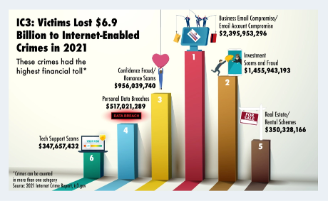 The FBI’s 2021 INTERNET CRIME REPORT includes information from over 800,000 complaints of suspected internet crime and reported losses from cyber attacks. They have also released state specific statistics on cyber crime. The report shows that phishing scams, non-payment/non-delivery scams, and personal data breach were the top three cyber crimes reported by victims in 2021.