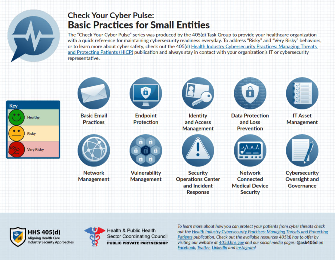 Check Your Cyber Pulse is a quick reference for small organizations to review the 10 cybersecurity practices recommended by HICP and their sub-practices and evaluate their cyber pulse on each one. There is a page that is dedicated to each of the 10 practices. You can do them one at a time, working with IT, to understand where you are on each of the cybersecurity practices.
