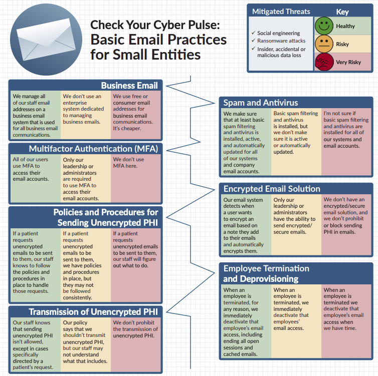 It doesn’t just ask “Do you have email protections in place?” It narrows down email protections and gives you three scenarios so that you can grade your organization on whether your protections are considered healthy, risky or very risky. You can learn more about cyber safety through the 405(d) Health Industry Cybersecurity Practices: Managing Threats and Protecting Patients (HICP) publication.