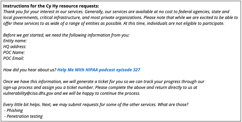 Our conversation with Josh just reiterates our Help Me With HIPAA tagline: HIPAA is not about compliance, it’s about patient care. We appreciate Josh spending some much time talking with us today and educating us all on all the things CISA and their partners are doing to help defend us against cyber threats. It is reiterating that cybersecurity is no longer only an IT issue.
