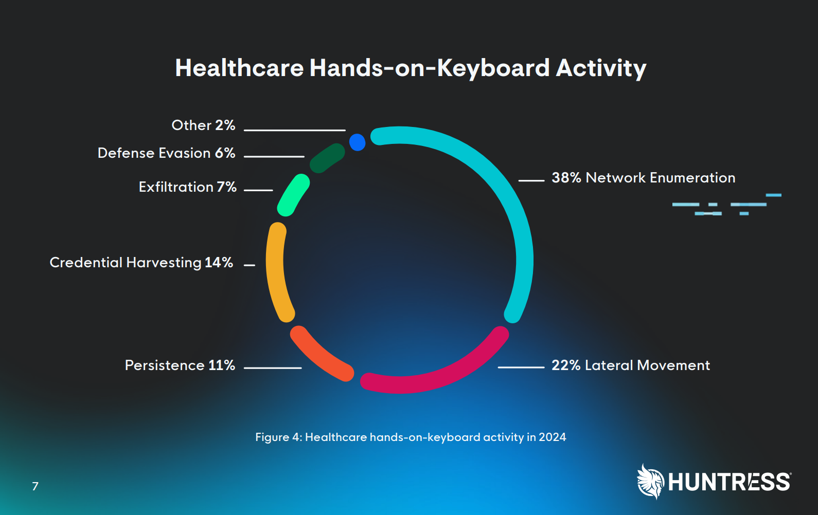 - Hands-on-keyboard intrusions—the human-driven phase of a breach—show attackers spending roughly 38% of their time mapping out networks and domains once inside healthcare environments.Network enumeration is what hackers (and security testers) do right after they get a foothold in a network… they start mapping the digital landscape.This is the digital version of snooping around someone’s office looking for the computers, servers, devices or anything that is connected.