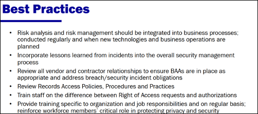It would behoove everyone to take this list of best practices and make sure you are doing them. It could make a difference in OCR seeing that you are taking your compliance obligations and your job to protect your patients data seriously.