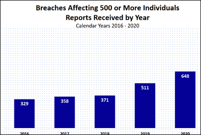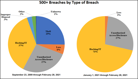 Now for the breaches reported in 2021, which includes breaches that occurred at the end of 2020, 71% were from hacking and 27% were from unauthorized access or disclosure. Big problem there.
