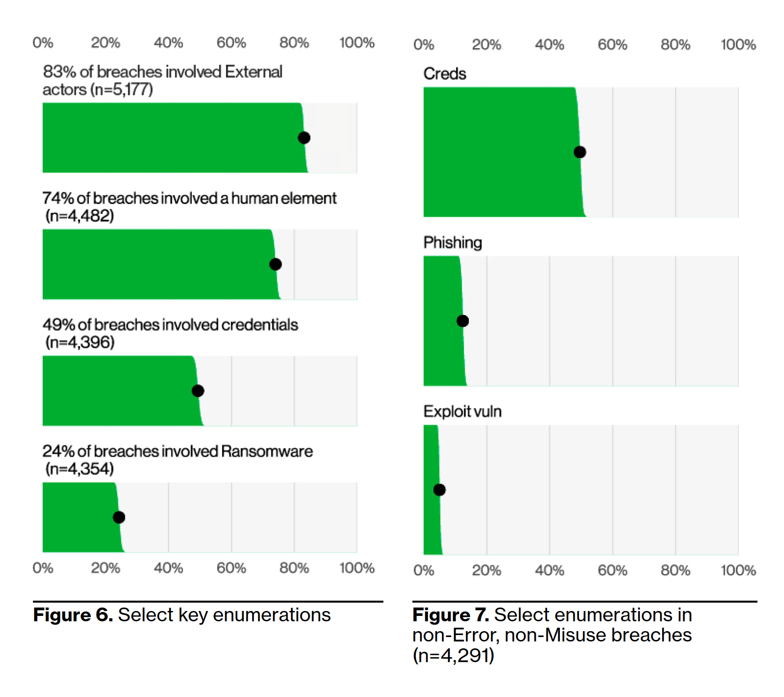 83% of breaches involved External actors, and the primary motivation for attacks continues to be overwhelmingly financially driven, at 95% of breaches. The three primary ways in which attackers access an organization are stolen credentials, phishing and exploitation of vulnerabilities.