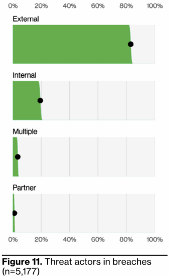The actor analysis from the report shows that 83% of breaches were caused by external actors, while internal actors account for 19% of breaches. Not very surprising there, but the fact that “partners” make up an even small percentage of breaches is startling. They’re not talking about your supply chain vendor being hit by a bad actor and the blast filtered to your organization here. They’re talking about a business partner being the initiator of the attack themselves. That’s scary that a partner you have some level of trust with is attacking organizations itself.